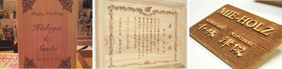 ホルツでは、木製品のレーザー加工を行なっております。表彰状や結婚式のウェルカムボード、表札、店舗用看板やメニューなど写真やデータさえあれば、杉や桧材にレーザー加工を施し、木のぬくもりを感じられる、温かな製品をご提供致します。