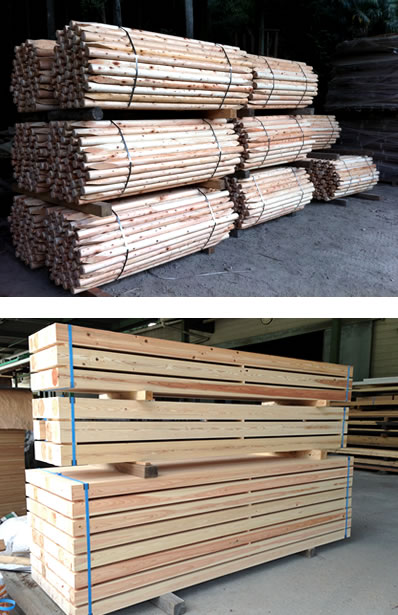 当社では常に大量の原木を用意しており、ドイツ・ベツネル製の円柱加工機とダブルソー製材機を設備しており、円柱加工、角材等のご発注、様々なサイズのご注文にすぐ対応いたします。