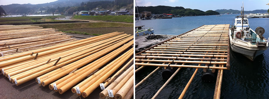 三重県産杉桧の間伐材を使用し、公園などの公共施設の高木の添え木、神社仏閣等の重要文化財の修理等の仮設足場として利用されております。牡蠣や真珠の養殖イカダでは桧の長丸太(5.4m,7.2m)を大量に必要とし弊社では随時在庫を取り揃えております。