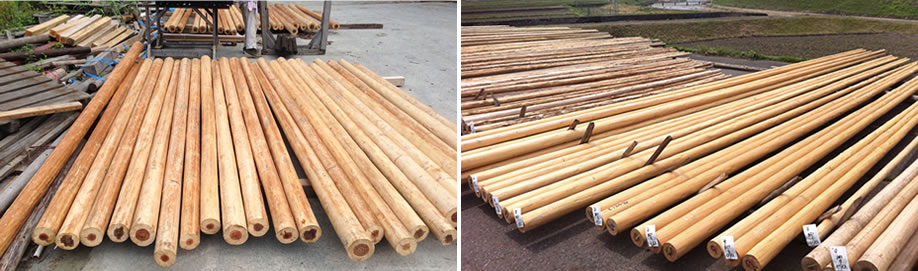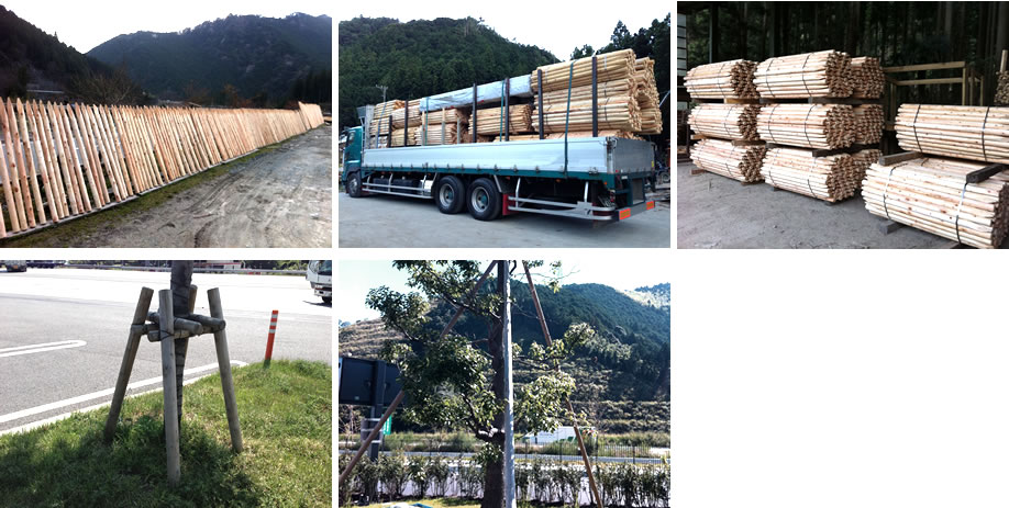 三重県産、奈良県産杉、桧特有の細長い間伐材を使用し、造園用支柱、足場丸太、イカダ用丸太の製造をしております。