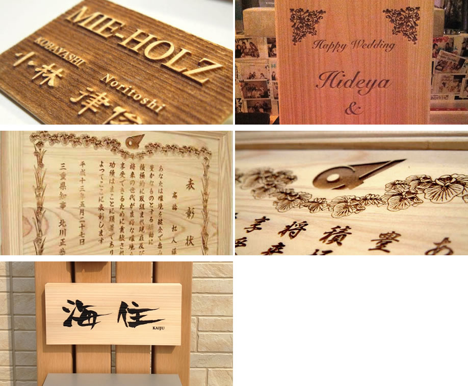 表彰状、名刺、結婚式のウェルカムボード、表札、店舗用看板、メニューなど木製品にレーザー彫刻を行います。