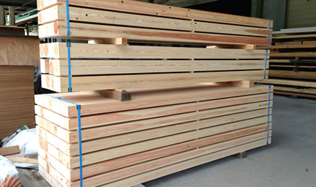 弊社ダブルソー製材機と、7軸モルダーにて、芯持ち垂木45角、50角、66角、75角、90角、105角を製材、4面プレーナー加工し、出荷致します。